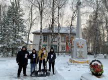 Стоит отметить, что День воинской славы совпадает с Днём волонтёра. Приятно было видеть, как в это морозное утро юноши из школы № 3 расчищали от снега территорию вокруг обелиска в микрорайоне Фибра, чтобы жители могли почтить память погибших земляков.