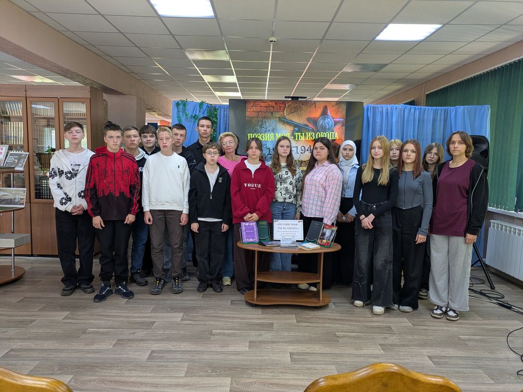 Ведущая Е.Н. Гришина с использованием презентации познакомила школьников с творчеством Николая Майорова, Михаила Дудина, Владимира Жукова, Алексея Лебедева. Ребята с интересом слушали стихи поэтов-фронтовиков в исполнении сотрудниц библиотеки М.Н. Смирновой и А.С. Миловидовой. Школьники узнали историю создания песни «Снегири», написанную Юрием Антоновым на стихи поэта В. С. Жукова, которую исполнила сотрудник библиотеки Т.Н. Наумова.