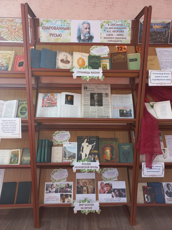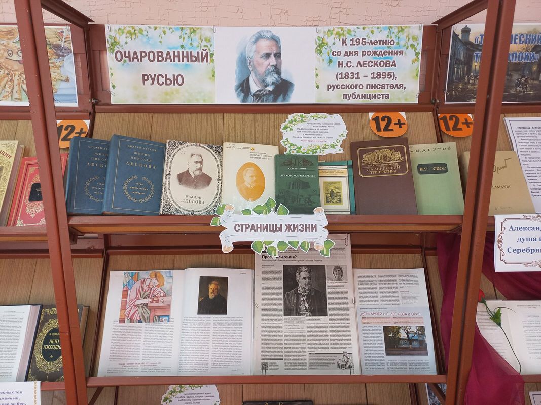 К этой дате в читальном зале оформлена иллюстрированная выставка-просмотр «Очарованный Русью», на которой представлены книги о жизни и творчестве писателя, воспоминания о нем сына, статьи из журналов и газет и, конечно, произведения Н.С. Лескова. Выставка украшена фотографиями из кинофильмов, снятых по произведениям автора.