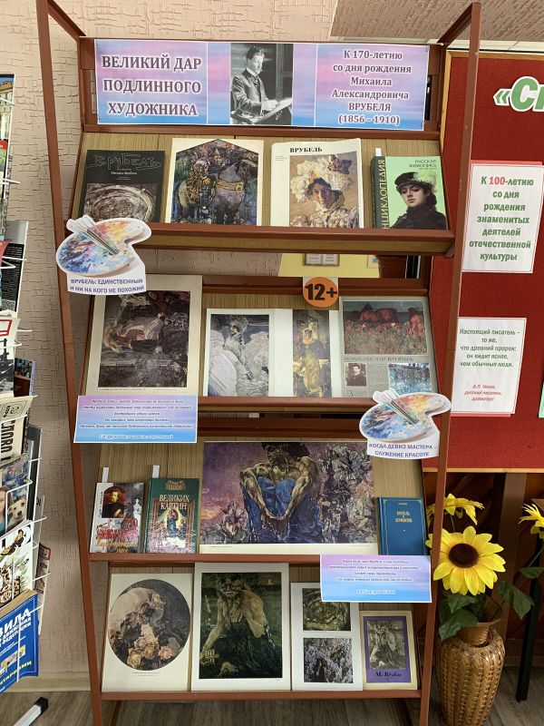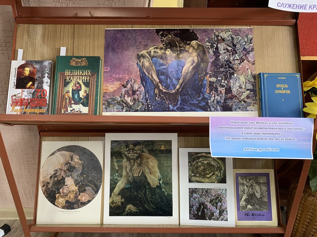 В читальном зале Заволжской библиотеки к юбилейной дате оформлена книжно-иллюстративная выставка, дающая полное представление о жизни и творчестве мастера, которые были совсем не просты и даже трагичны. Искусствоведческая литература и подборка репродукций помогут прикоснуться к притягательной тайне Врубеля, которая едва ли когда-нибудь будет раскрыта.